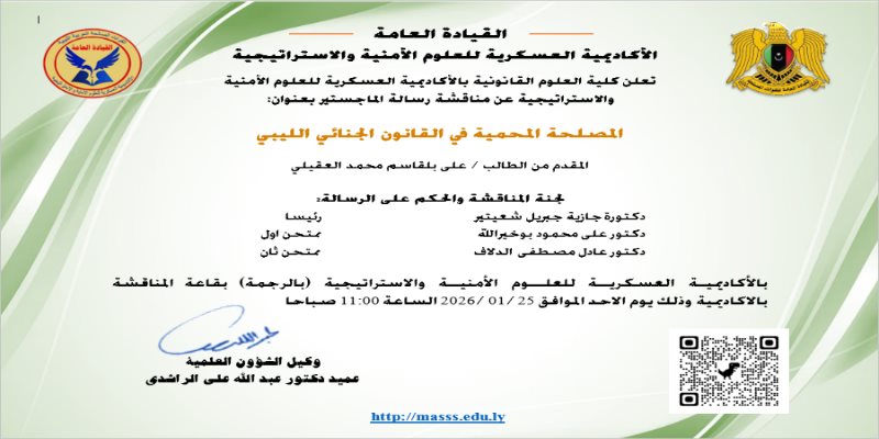 تعلن كلية العلوم القانونية بالأكاديمية العسكرية للعلوم الأمنية والاستراتيجية عن مناقشة رسالة الماجستير في قسم (القانون الجنائي) بعنوان: