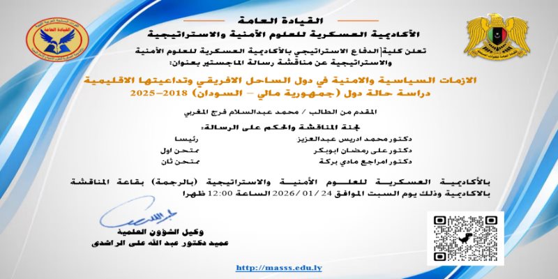 تعلن كلية الدفاع الاستراتيجي بالأكاديمية العسكرية للعلوم الأمنية والاستراتيجية عن مناقشة رسالة الماجستير في قسم (الدفاع الاستراتيجي) بعنوان: