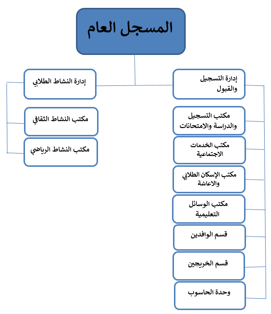 - إعداد الإحصائيات والبيانات التفصيلية عن عدد الطلاب المقيدين بالجامعة حسب جنسهم وجنسياتهم وسنوات الدراسة وشعب تخصصاتهم ومحل إقامتهم.