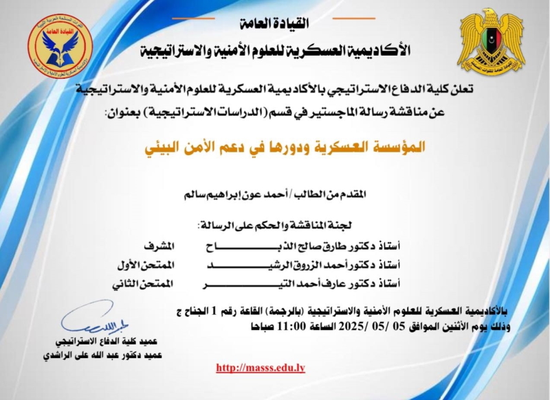 تعلن كلية الدفاع الاستراتيجي بالأكاديمية العسكرية للعلوم الأمنية والاستراتيجية عن مناقشة رسالة الماجستير في قسم (الدراسات الاستراتيجية) بعنوان: