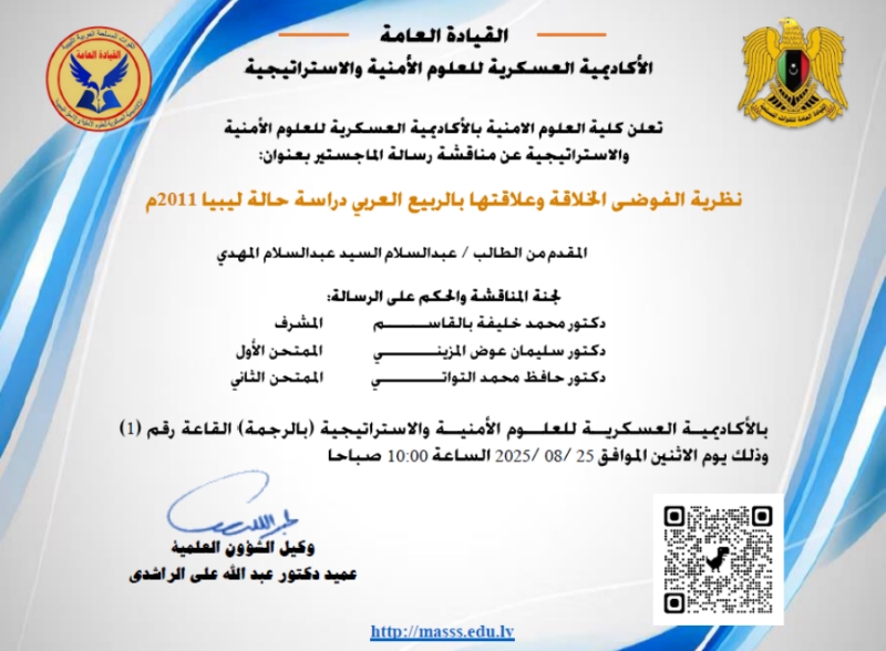 تعلن كلية العلوم الامنية بالأكاديمية العسكرية للعلوم الأمنية والاستراتيجية عن مناقشة رسالة الماجستير في قسم (العلوم الامنية) بعنوان: